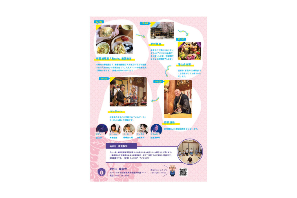 はなまつり2026 2026.01 真宗誠照寺派 北野山 専念寺さまでおこなわれる『はなまつり』のチラシとポスターを制作をしました。今年はビビットな色合いで枝垂れ桜をイメージしてほしいとのご要望から、明るい配色でお作りしました。 Client:北野山 専念寺 Illustration:kitomy Design:kitomy