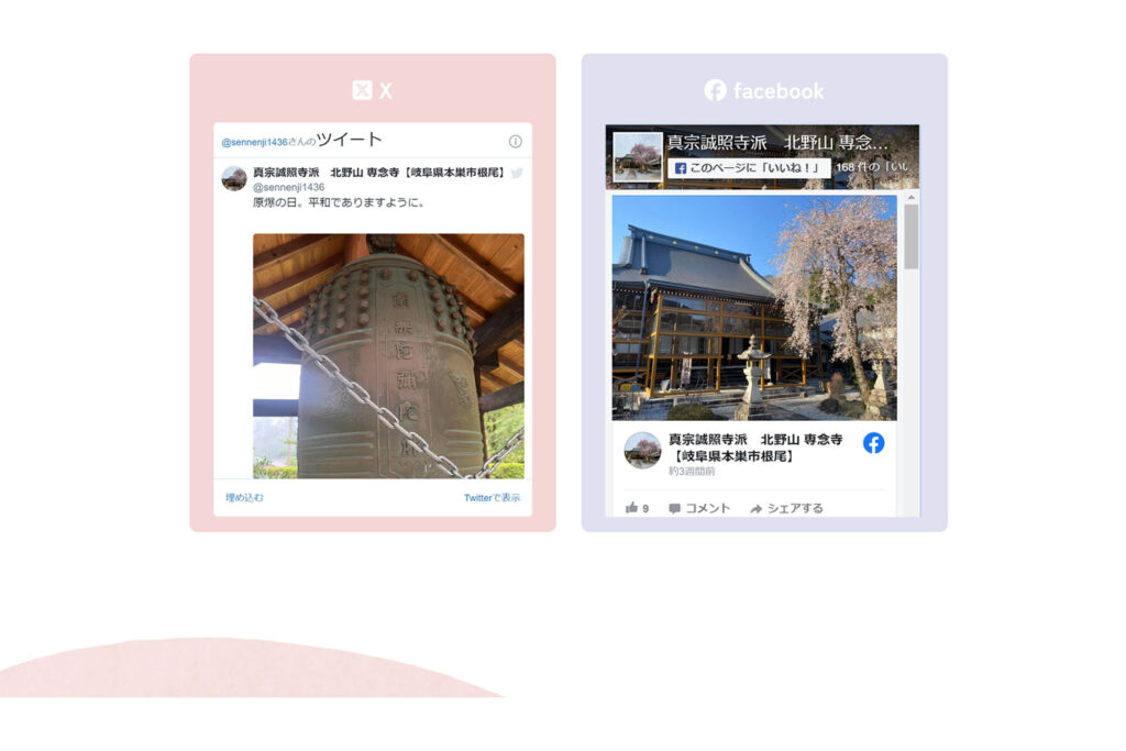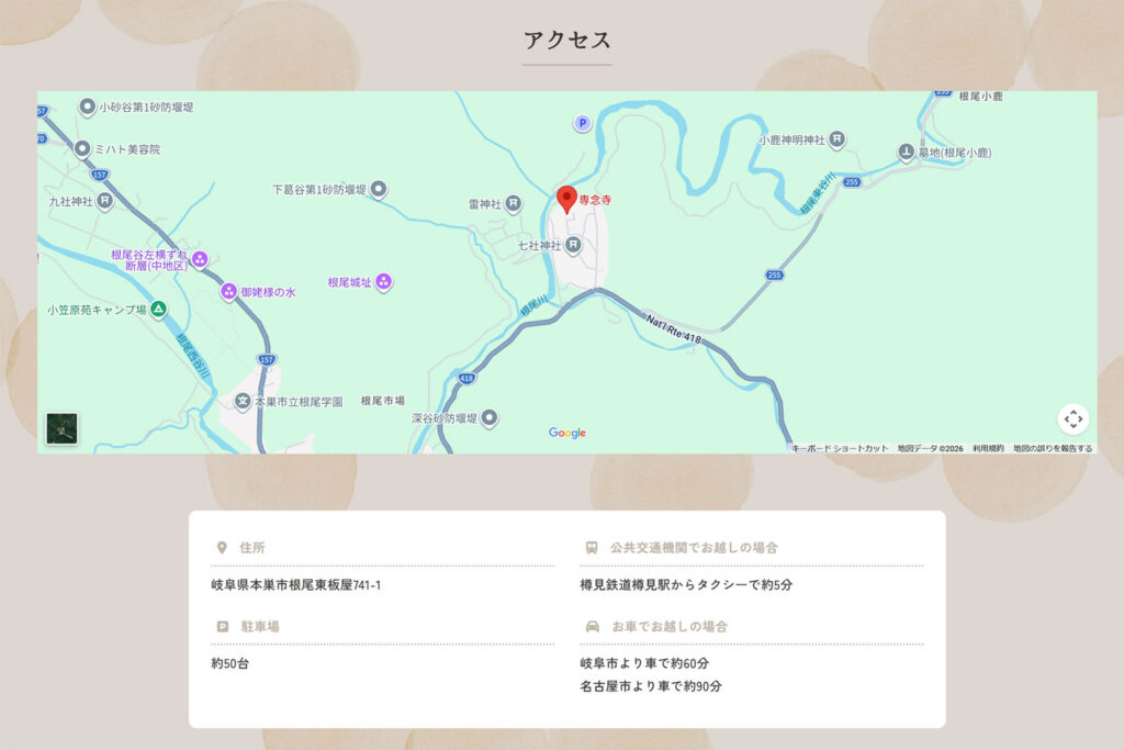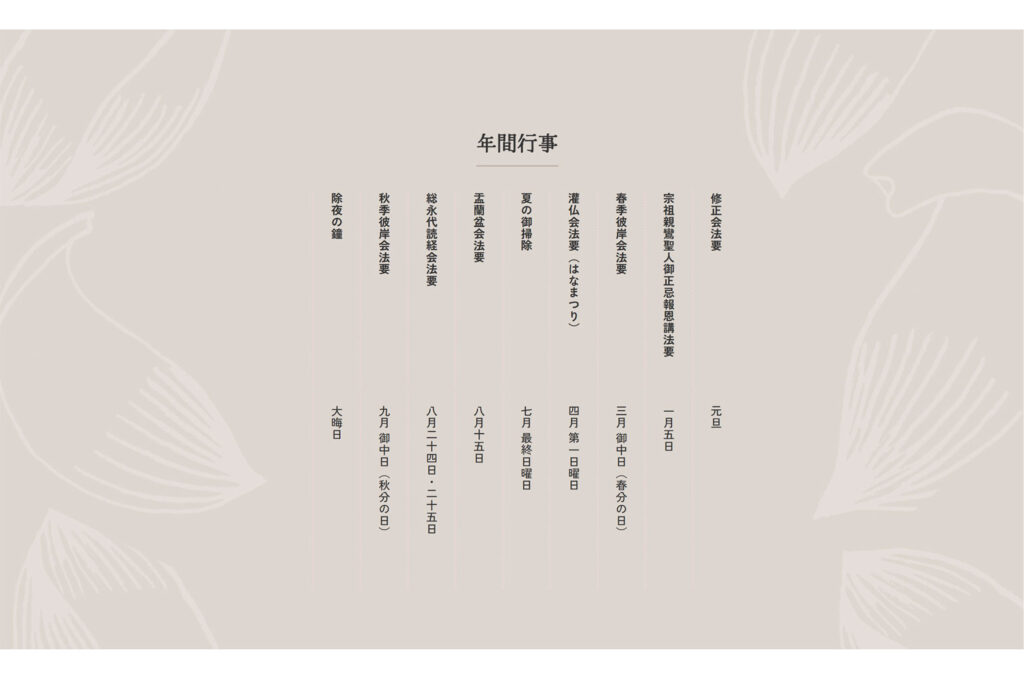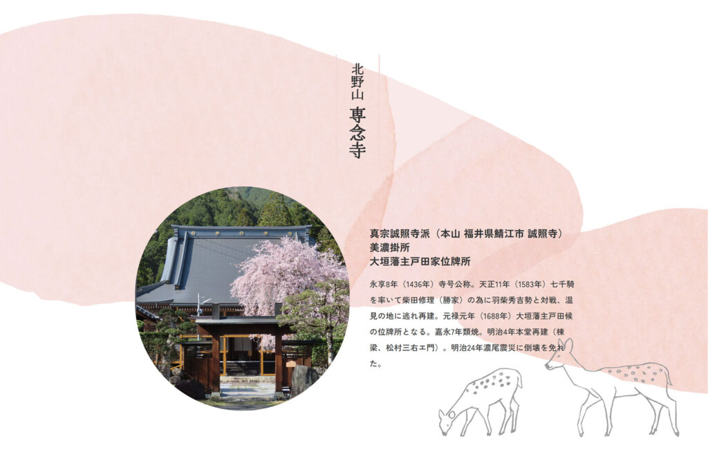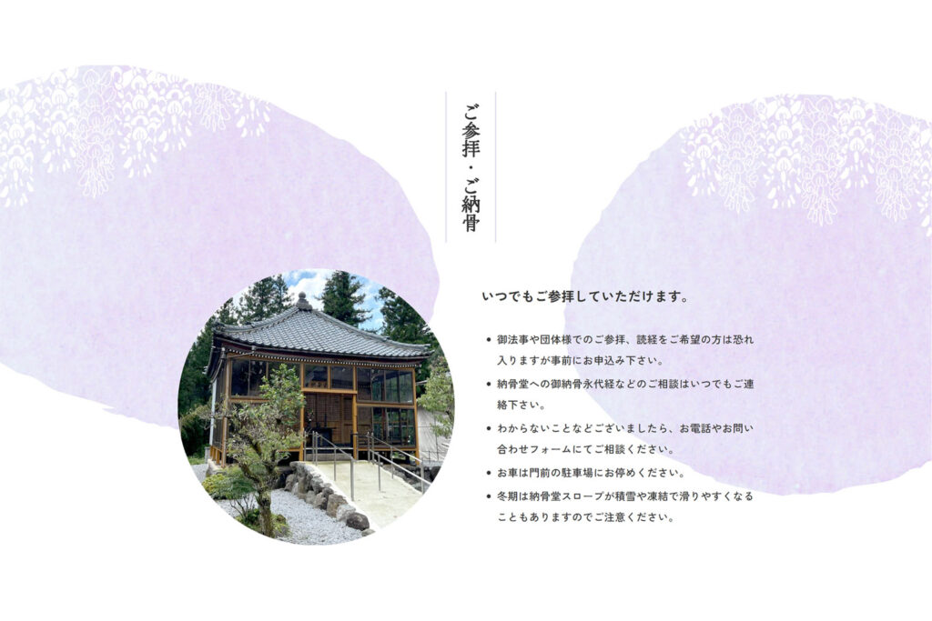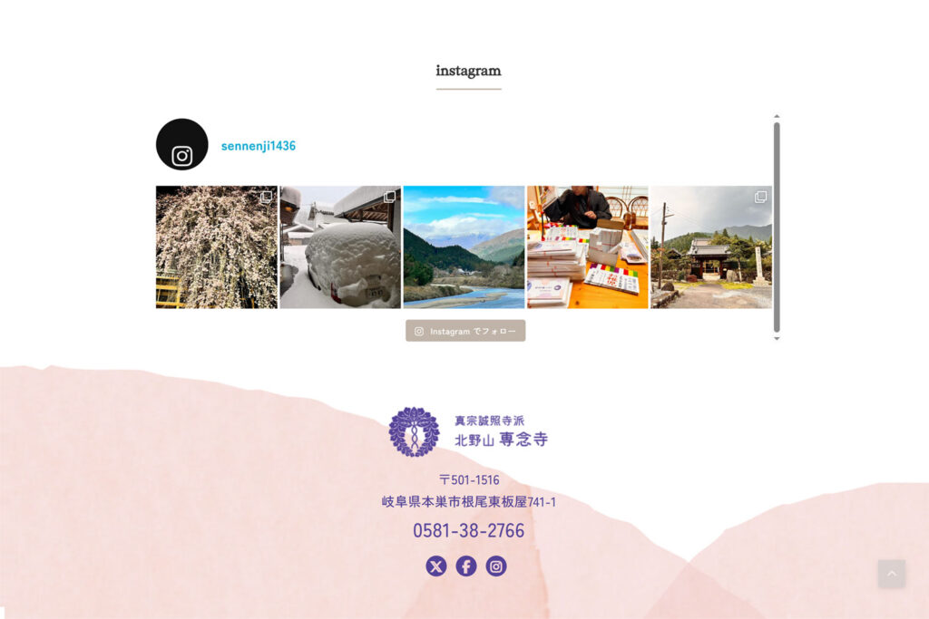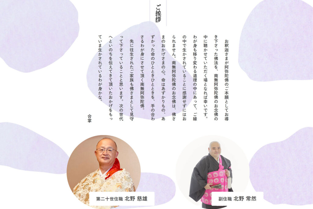 真宗誠照寺派 北野山 専念寺さまのウェブサイトを制作をしました。柔らかい印象にしたいとのご要望から水彩の素材や近隣の野山に現れる動物のイラストをあしらったデザインにしました。